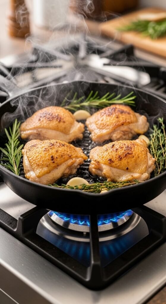 This is where most home cooks go wrong — they skip the sear. Even if you’re going to finish the thighs in the oven, a quick pan-sear first is the key to golden, crackling skin.