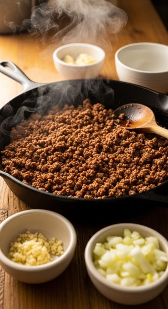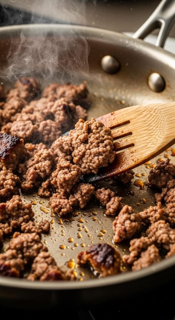 Add the beef, break it into large chunks, and let it sit untouched for 2–3 minutes. You want a golden-brown crust before you start breaking it down further. Then use your spoon to crumble it into smaller pieces.