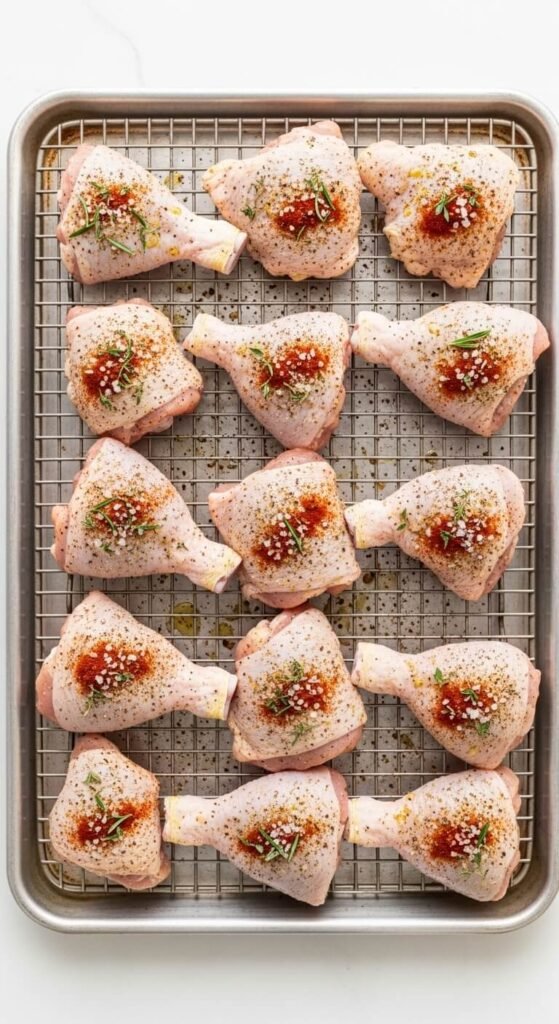 Moisture is the enemy of crispy skin. Before you do anything else, pat your chicken completely dry with paper towels — every surface, every crevice.