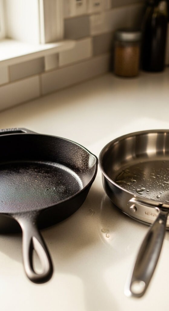 - Cast iron — holds heat like a dream, perfect for searing and baking; great for going from stovetop to oven