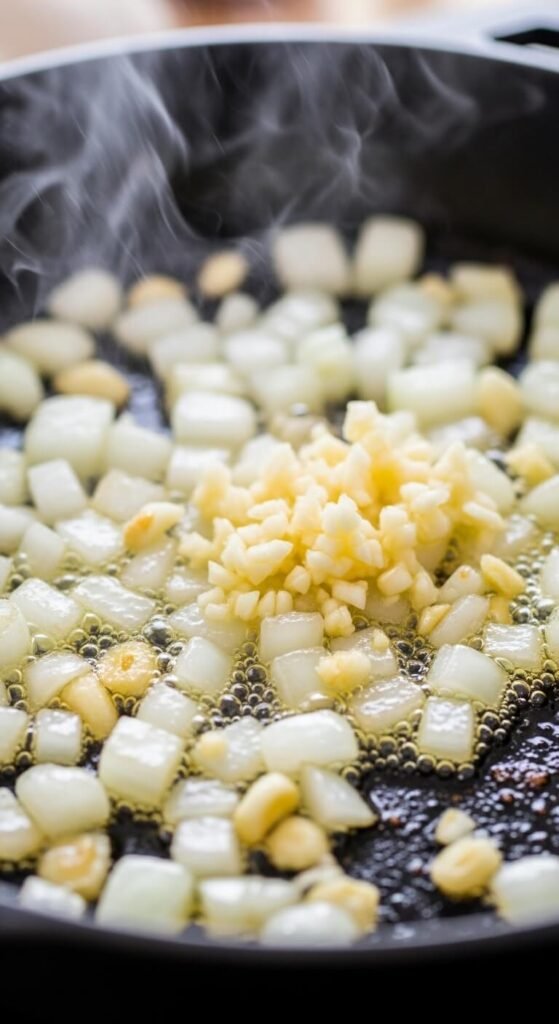 Step 3: Build the aromatics Remove the protein and sauté your onions, garlic, or shallots in the same pan. Those browned bits from the protein? Scrape them up — they’re the best part.