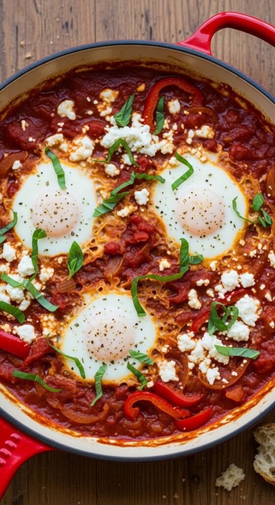 - Shakshuka — poached eggs in a spiced tomato sauce; breakfast, lunch, or dinner