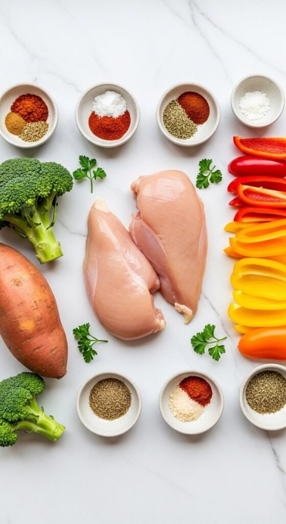 - 1–2 proteins (chicken thighs, ground turkey, eggs, chickpeas)