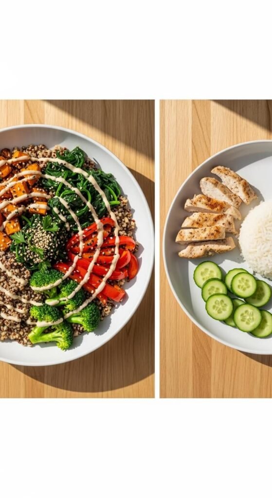- Grain bowls: Rice or quinoa as the base, with protein, roasted veggies, and a simple sauce on the side.